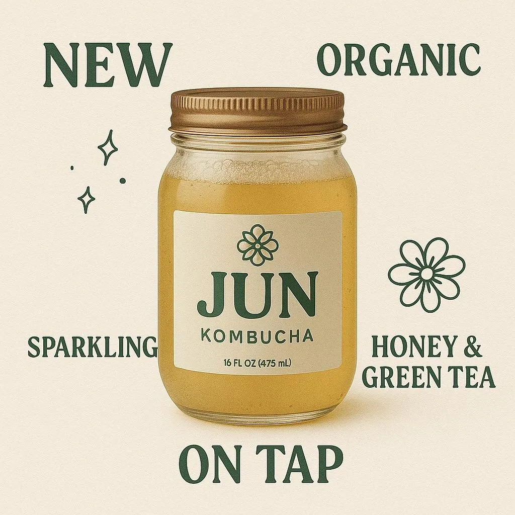 The “champagne of kombuchas,” Jun is brewed with organic green tea and raw honey for a light, bright, and effervescent sip. Smooth, probiotic-rich, and naturally uplifting — now flowing straight from the tap.